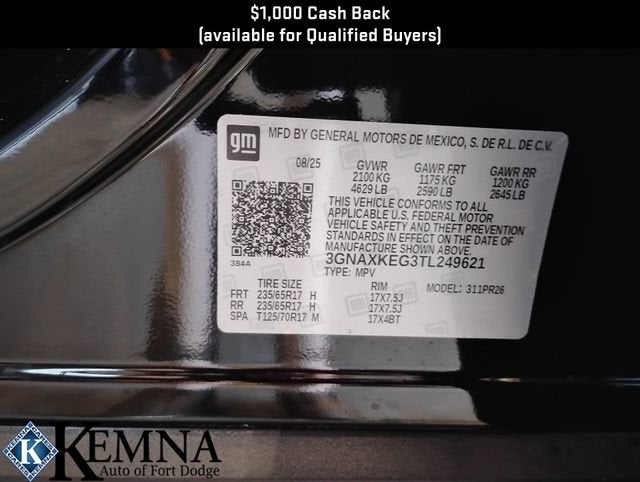 Kemna Price- sale price is adjusted by Kemna for all customers, this is separate from GM pricing programs and can not be combined. Tax, title, license and dealer fees (unless itemized above) are extra. Not available with special finance or lease offers. Tax, title, license (unless itemized above) are extra. Not available with special finance, lease and some other offers. While great effort is made to ensure the accuracy of the information on this site, errors do occur so please verify information with a customer service rep. This is easily done by calling us at (800) 588-8458 or by visiting us at the dealership. **With approved credit. Terms may vary. Monthly payments are only estimates derived from the vehicle price with a 72 month term, 4.9% interest and 20% downpayment.The Manufacturer’s Suggested Retail Price excludes tax, title, license, dealer fees and optional equipment. Dealer sets final price.