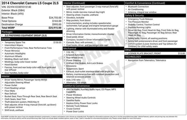 The 2014 Chevrolet Camaro 2LS is a sleek and powerful sports car that offers an exhilarating driving experience. With its striking black exterior and well-appointed interior, this Camaro is sure to turn heads wherever you go.